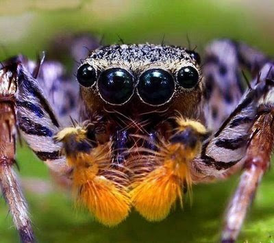 ༢༽ དམིགས་བསལ་དཔག་འཆོང་སྡོམ་འཐག་jumping spiderགི་རིགས་ནི་མིག་གིས་ཧ་ཅང་ཡག་པོ་མཐོང་ཐུབ་ཀྱི་ཡོད། ཁོང་ཚོའི་མགོ་བོའི་མདུན་ཕྱོགས་སུ་མིག་ཧ་ཅང་ཆེན་པོ་དེ་འདྲ་ཡོད།